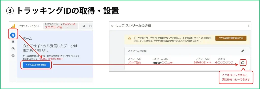 プロパティを作成すると、トラッキングIDが発行されます。このIDをコピーし、WordPress側に設定します。