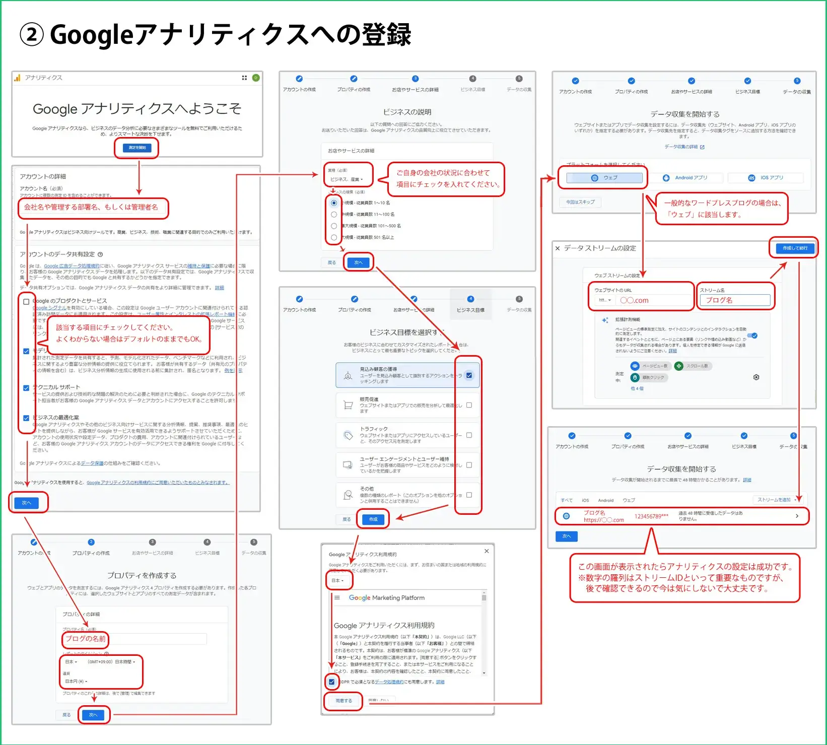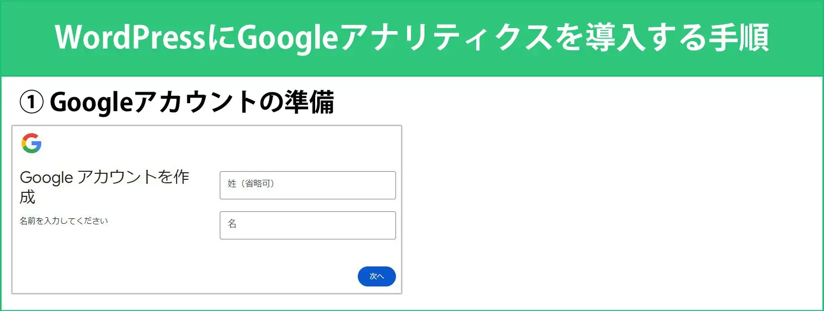 ここからは、WordPressにGoogleアナリティクスを導入する手順を解説します。利用するにはGoogleアカウントが必要ですが、まだお持ちでない場合は、以下の流れに沿って作業を進めてください。
