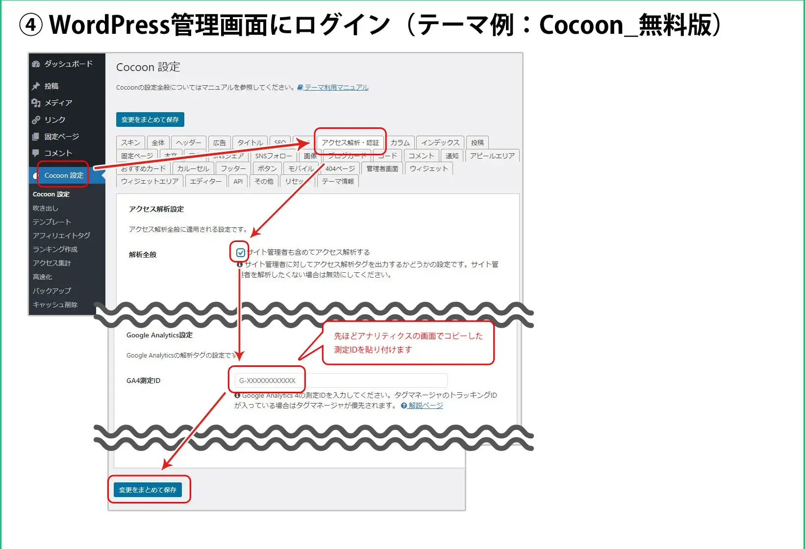 WordPressの管理画面にログインし、「Cocoon設定」→「アクセス解析・認証」から、「GA4測定ID」にトラッキングコードを貼り付けて保存します。