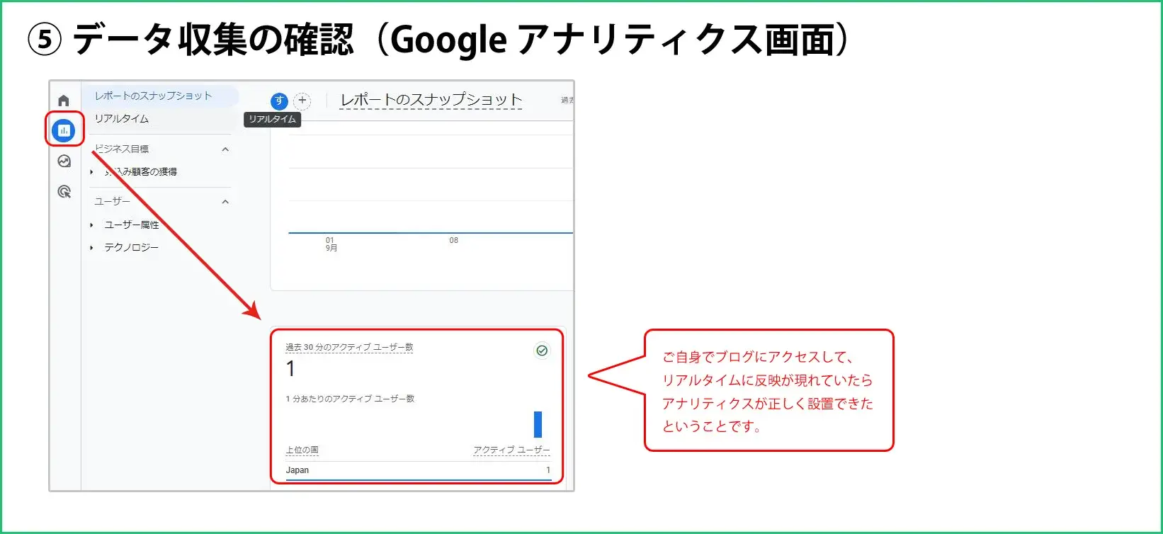 設定後、しばらくするとGoogleアナリティクスにデータが反映され始めます。リアルタイムレポートなどで、データが取得できているかを確認してください。問題なければ、初期設定は完了です。