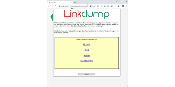 下のテスト領域を使用してlinkclumpを試すか、ページの下部にあるオプションボタンをクリックして、利用可能な多くのオプションを調べます。