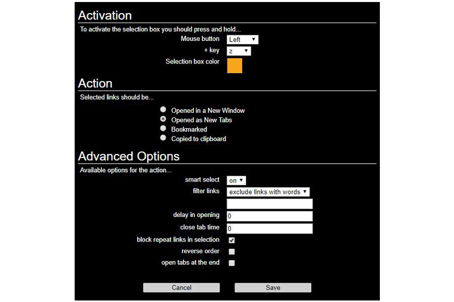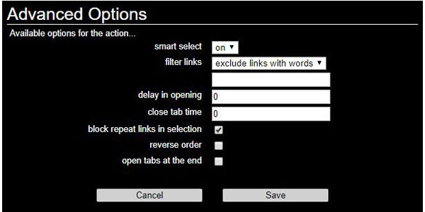 一括で開いたタブを削除するまでの時間を設定します。デフォルトの「0」を入力しておけばタブ削除はされません。本項目は単体で使っても余り意味がないですが、上段項目の「delay in opening」とあわせて使うとタブエリアをスッキリ整理できます。「delay in opening」は複数リンクを一括で開く場合、一つずつ開く間隔を秒数で指定できる項目です。