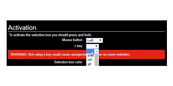 linkclumpでは基本的にキーボードとマウスを使って操作します。しかし実は、裏技的にマウスだけを使ってリンクを一括で開く方法もあるのです。設定画面のキーボード選択プルダウンの最上部に空欄があるので選択してください。これでマウスの操作だけで複数リンクの一括操作が可能になりました。