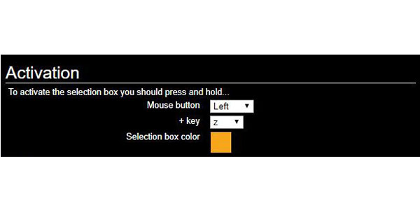 デフォルトの「Zキー+マウスの右クリック」は変更可能です。マウスとキーボードの組み合わせは基本ですが、キーと左右どちらのマウスクリックにするかは変えられます。また、選択範囲の線の色も好みで変えられます。