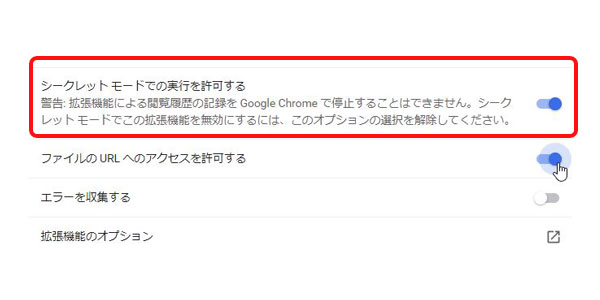 Linkclumpはデフォルト設定のままでは、Google Chromeブラウザのシークレットモードでは使えません。シークレットモードで使うためには、Chromeの右上の設定から「その他のツール」>「拡張機能」を選択します。その中からLinkclumpを見つけて「詳細」をクリック。詳細ページ下部の「シークレット モードでの実行を許可する」にチェックをいれます。