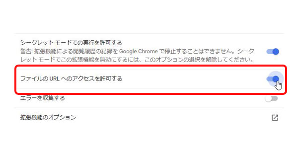 Chromeの右上の設定から「その他のツール」>「拡張機能」を選択します。その中からLinkclumpを見つけて「詳細」をクリック。詳細ページ下部の「ファイルの URL へのアクセスを許可する」にチェックを入れてください。