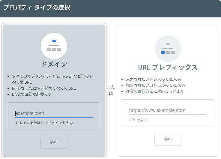 今回は、サブドメインやURLの違いをまとめて管理できる点を考え、ドメインプロパティを選択しました。