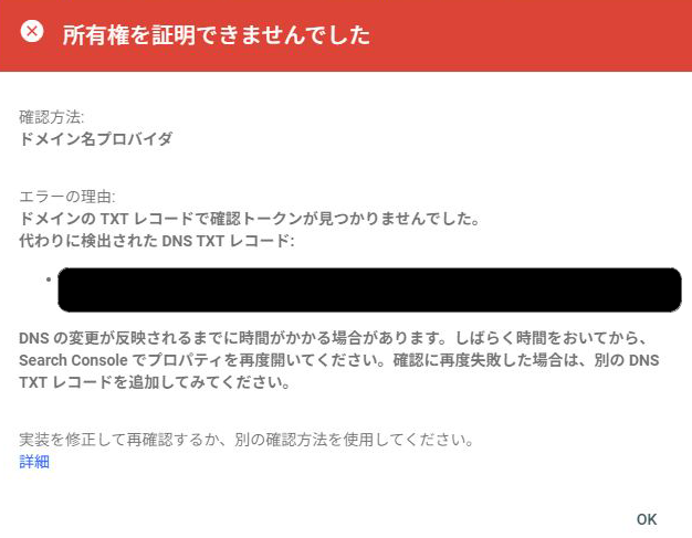 TXTレコードを追加したあと、Search Consoleに戻って所有権の確認を行うと、「所有権を証明できませんでした」というメッセージが表示されました。