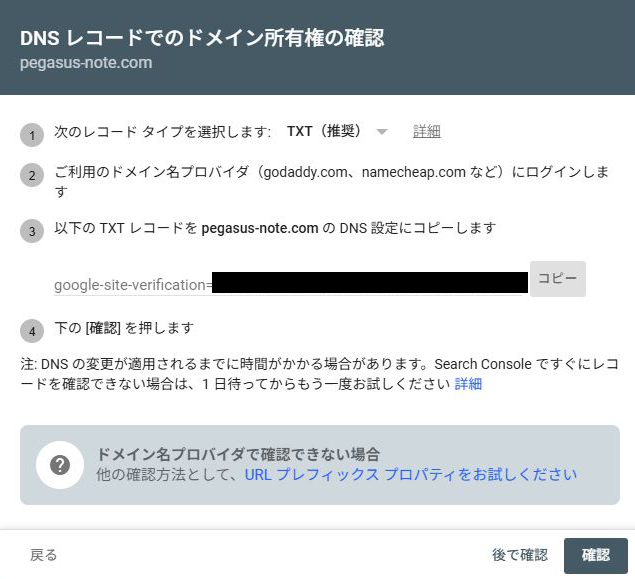 ドメインプロパティを選択すると、Search ConsoleからDNSにTXTレコードを追加して所有権を確認するよう案内が表示されました。