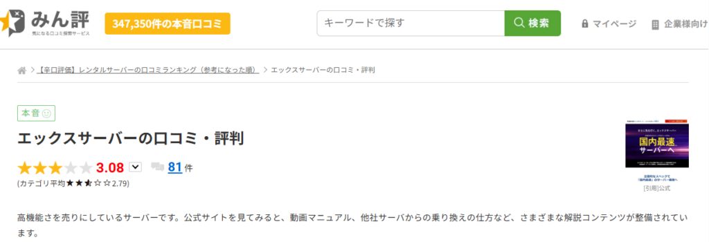 エックスサーバーの評判を客観的に把握するために、口コミサイト「みん評」に掲載されているレビューも確認しました。