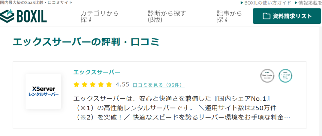 BOXILにはエックスサーバーの口コミが多数掲載されており、企業のシステム担当者やWeb担当者など、業務でサービスを利用しているユーザーの意見も含まれています。掲載されているレビューを見ると、エックスサーバーは比較的高い評価を受けており、特にサーバーの安定性や表示速度について評価する声が多く見られました。