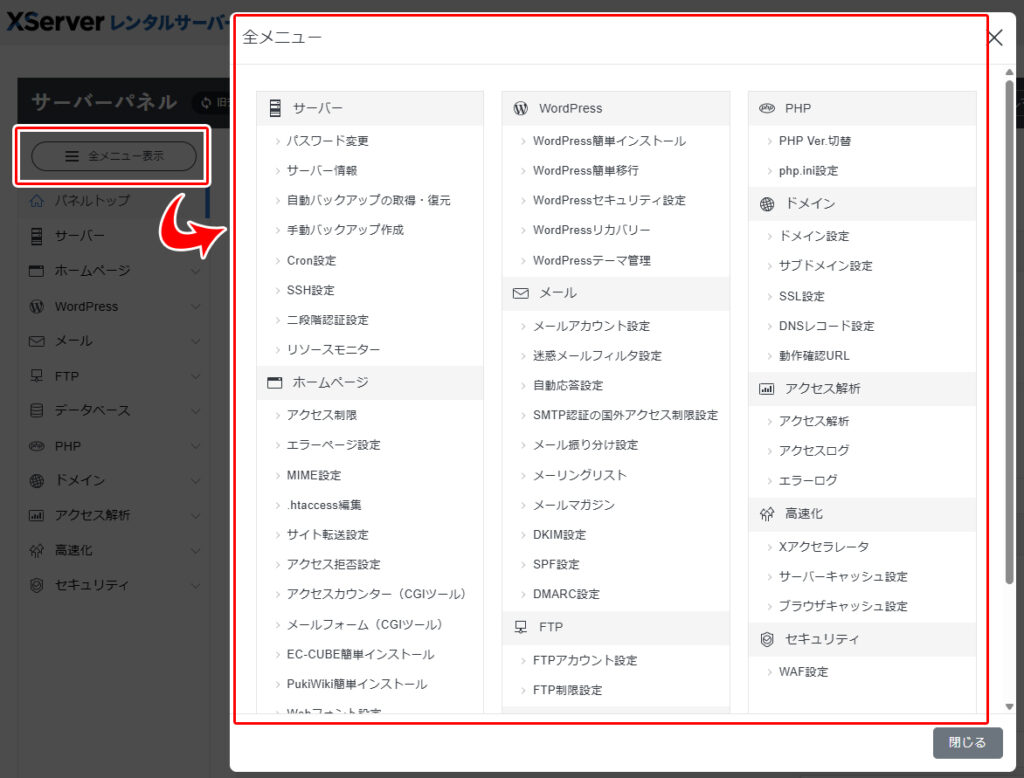 エックスサーバーのメインメニューは、左カラムのプルダウン式ですが、上部の「全メニュー表示」を押すと、大項目→小項目が全部一覧で見られます。