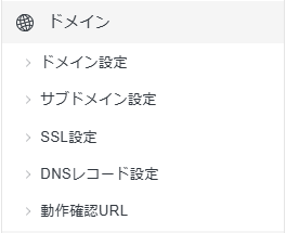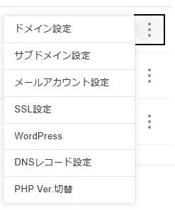 また、三点リーダーメニューからは、ドメイン設定、サブドメイン設定、メールアカウント設定、SSL設定、WordPress、DNSレコード設定、PHP Ver.切替といった項目を選択できます。