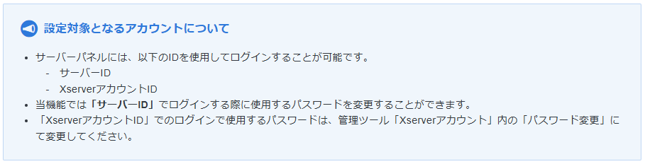 あくまでもサーバーIDでログインするとき用のパスワードを変更する項目です。XserverアカウントIDでログインする際のパスワードはここでは変更できません。