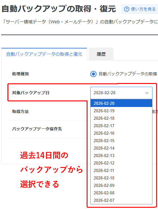 この「自動バックアップの取得・復元」項目では、サーバー領域のWeb・メールデータを日にちごとにダウンロードしたり、復元したりできます。