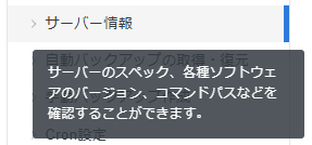 サーバーの詳細なスペックやApacheやPHPなどのバージョン、ネームサーバー情報を確認できます。